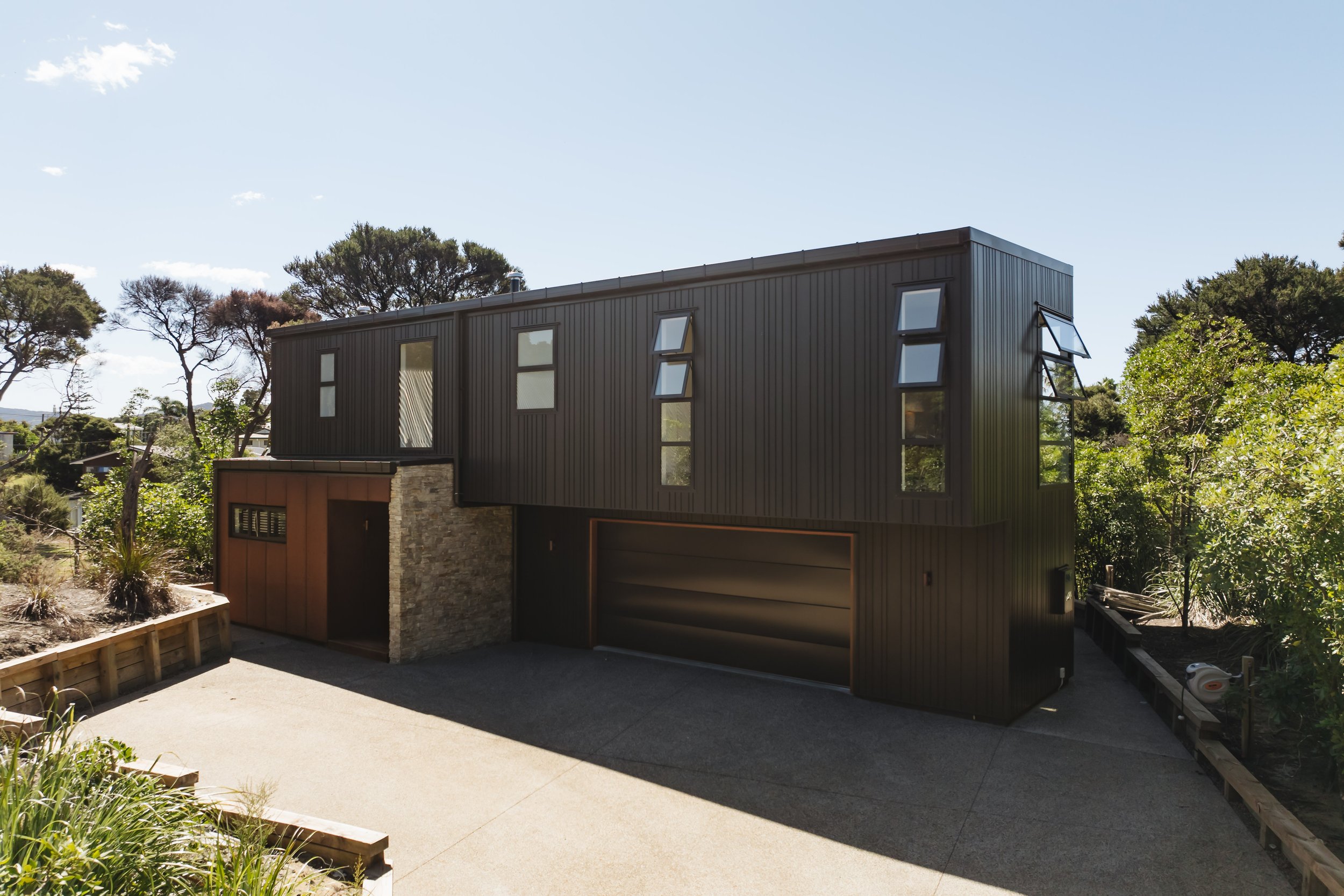 The material palette was chosen to echo the landscape and withstand the coastal conditions. Durable aluminium cladding ensures low maintenance, with irregular negative detailing that echoes the vertical lines of the surrounding tree trunks. Stonework grounds the home to the hillside, while rusted Corten steel adds a weathered permanence, blending the building seamlessly into its environment. A monopitch roof references the relaxed character of the classic New Zealand bach, yet here it is refined into a modern architectural expression.