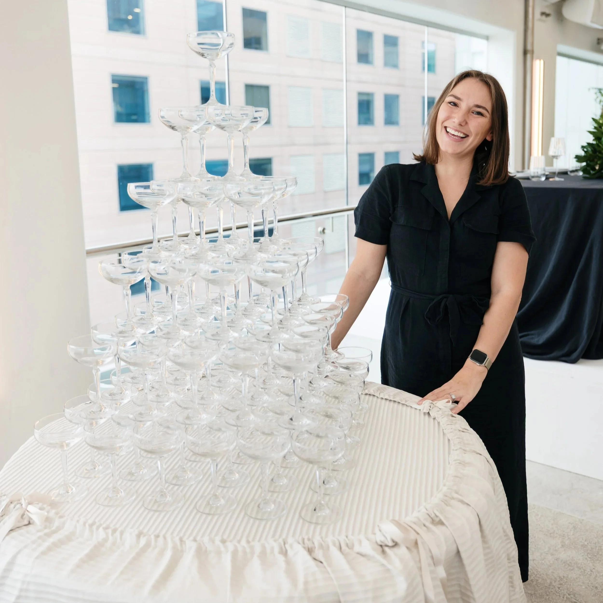 For Makenzie, the joy of the work lies in those shared moments of celebration. She still personally sets up many of the towers herself, carefully stacking each glass to ensure the structure is perfect before the first pour begins.