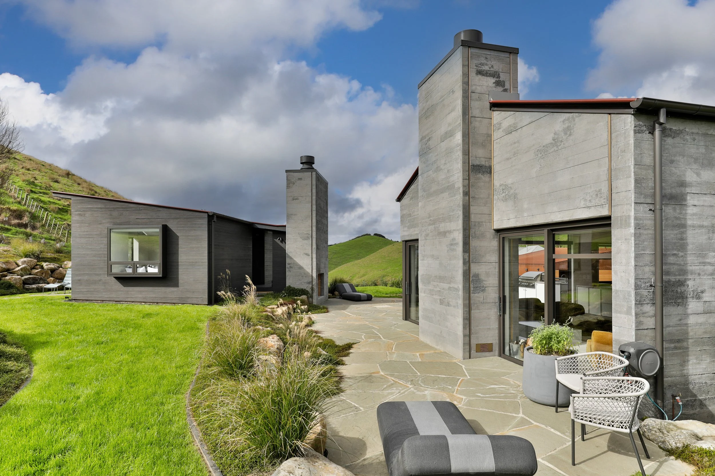The main residence is the boldest statement of the three. Built from precast concrete and finished with a red roof that nods directly to an old woolshed, it commands its position in the landscape with quiet authority. Inside, the rawness of the material is carried through with intention. A precast concrete fireplace anchors the living space, polished concrete floors run underfoot, and a built-in curved dining nook provides a sculptural focal point that is as functional as it is beautiful. Upstairs, the entire upper level is given over to a single bedroom suite: a standalone bath, dressing room, and ensuite that bring a genuine sense of luxury to what is, at its core, a raw and honest building.